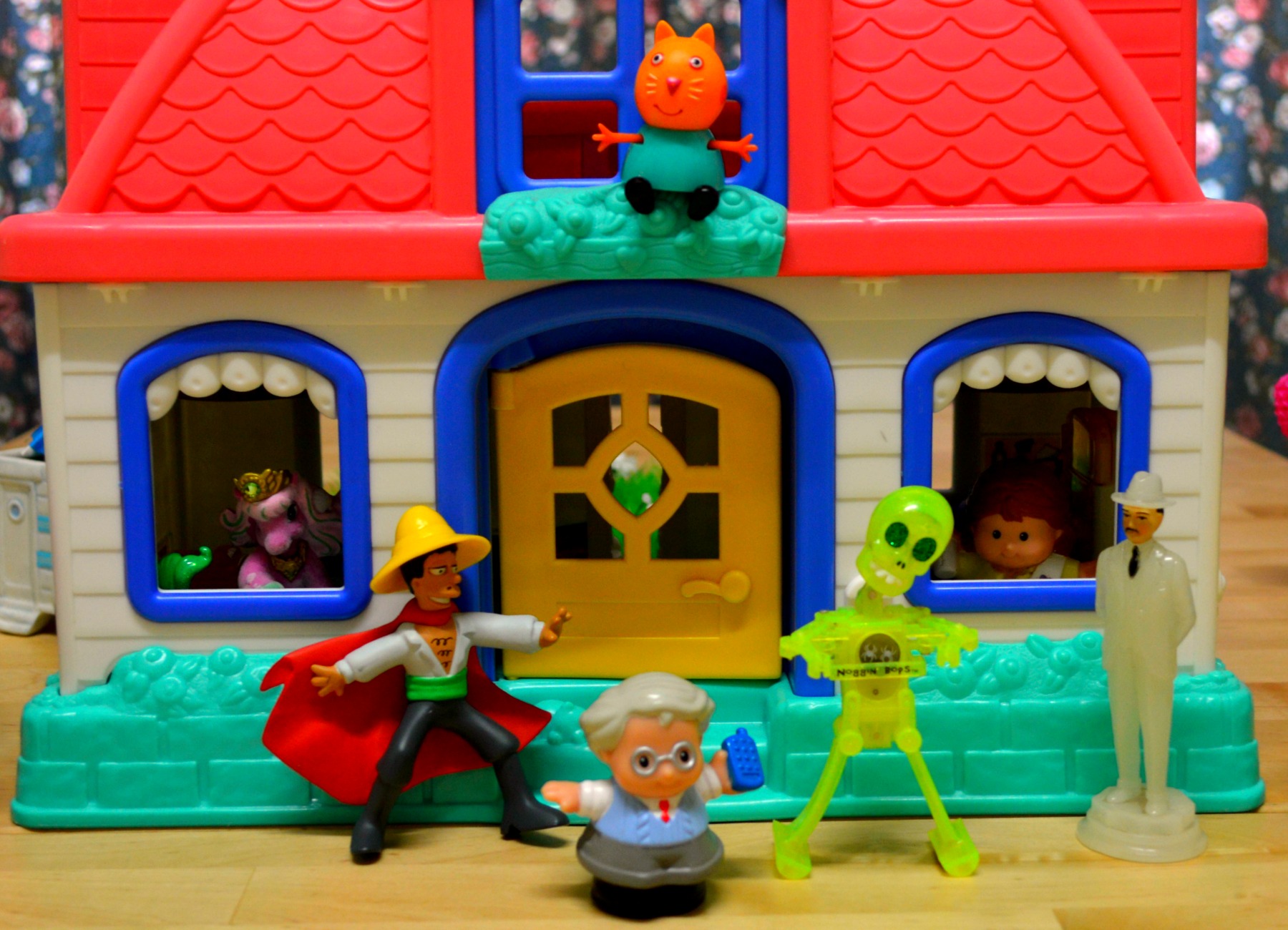 Meet the plastic family. They’ve recently purchased this house in a decent neighborhood. We think they’ve had a good run and retired early. While he picked up flying as a hobby, she soon grew bored after the house was decorated and the animals came. After standing the pet test, the plastic family were ready for kids. They used to be actors, so they adopted a whole bunch of them. With the kids came the Grandparents and the Nanny and there’s the extended family, friends and neighbors.